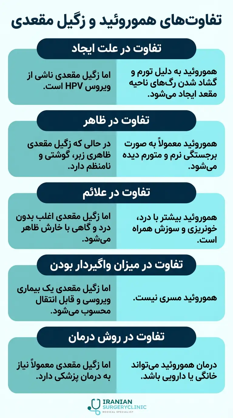 زگیل مقعدی که ناشی از ویروس پاپیلومای انسانی (HPV) است، معمولاً بهصورت تودههای نرم و مرطوب اطراف مقعد ظاهر میشود که شبیه گلکلم یا برجستگیهای کوچک هستند. این زگیلها معمولاً بدون درد هستند، اما ممکن است خارش یا ناراحتی ایجاد کنند. در حالی که هموروئید به تورم و التهاب رگهای خونی در ناحیه مقعد اشاره دارد و میتواند باعث درد و خونریزی شود؛ بهویژه زمانی که فرد در حال اجابت مزاج است.
