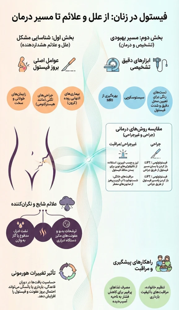 علتهای مختلفی برای بروز فیستول در زنان وجود دارد که از جمله مهمترین آنها میتوان به زایمانهای سخت، جراحیهای لگنی، پرتودرمانی و بیماریهای التهابی روده اشاره کرد. تشخیص به موقع و استفاده از روشهای تشخیصی مانند معاینه فیزیکی، تستهای تصویربرداری و سیستوسکوپی میتواند در شناسایی دقیق محل فیستول و انتخاب درمان مناسب بسیار مؤثر باشد.